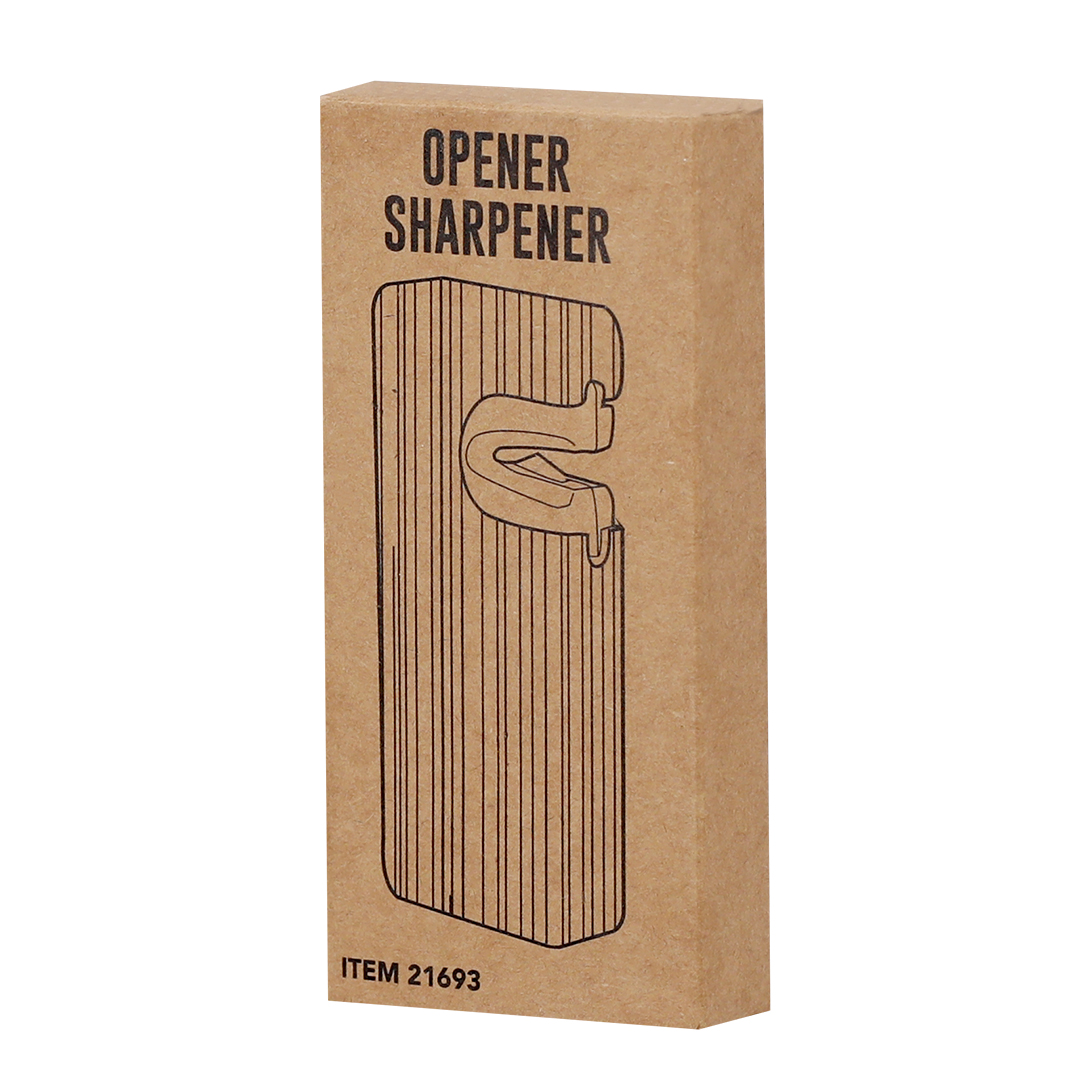 Práctico abridor y afilador 2 en 1, fabricado en bambú. Incluye afilador de cuchillos integrado, abridor de botellas e imán.