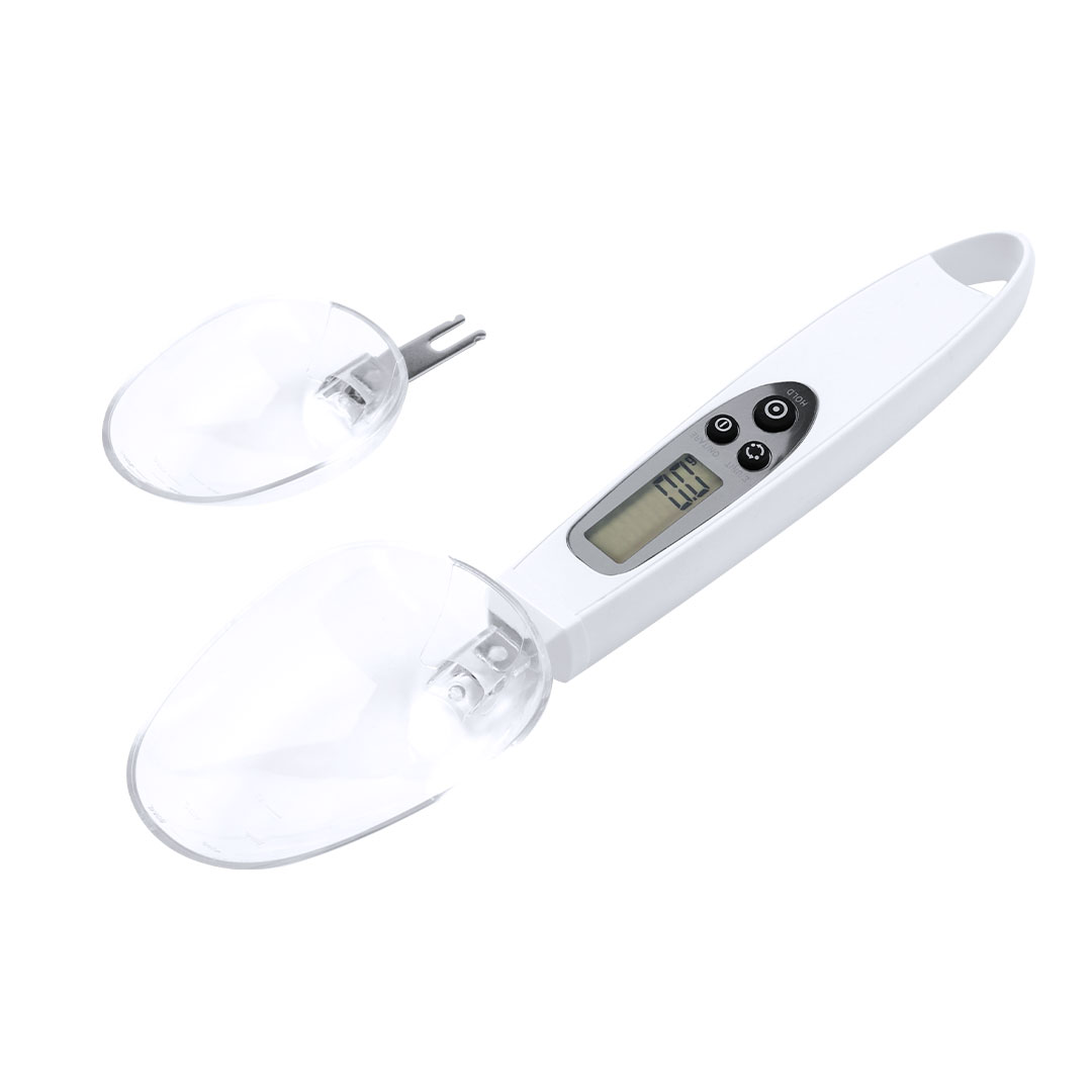 Práctica báscula digital con cuchara, válida para líquidos y sólidos. Incluye 2 cucharas intercambiables y pantalla digital LCD situada en el mango, mostrando el pesaje con una precisión de 0,1g. Botón para mostrar el peso en gramos (g), onzas (oz), o mililitros ( ml), con función de memoria y posibilidad de pesar dos ingredientes. Ambas cucharas llevan grabada una escala de medición adicional para líquidos: la cuchara pequeña desde 5 ml hasta 25 ml; y la cuchara grande desde 10 ml hasta 50 ml. Con manual de instrucciones en español e inglés. Alimentada por pila de botón (incluida) y presentada individualmente en caja de diseño kraft.