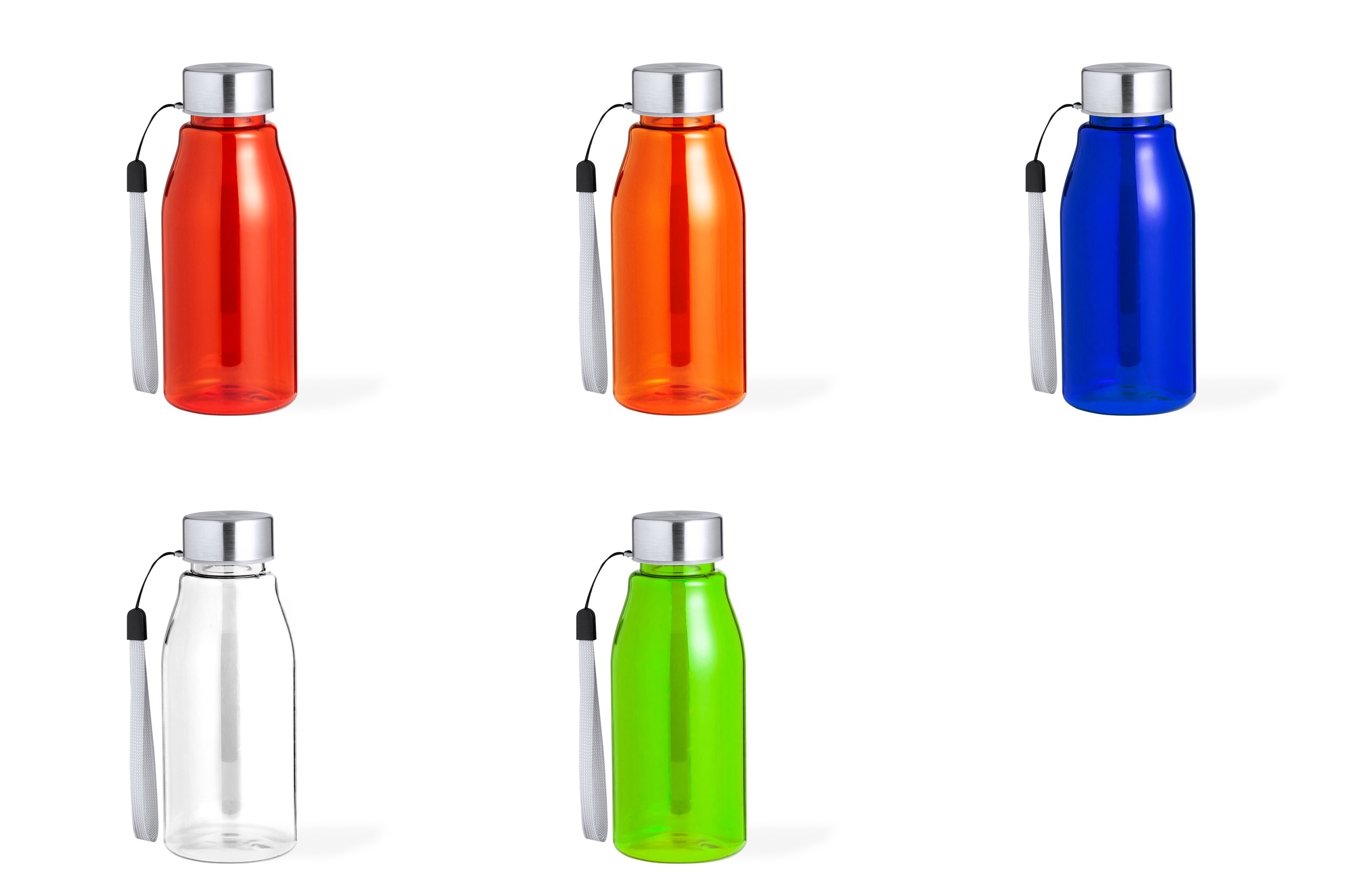 Bidón fabricado en RPET de 350 ml de capacidad, libre de BPA. Tapón a rosca en acero inox, con cordón de transporte. Disponible en variada gama de colores. Presentado en una bolsa de papel reciclado.