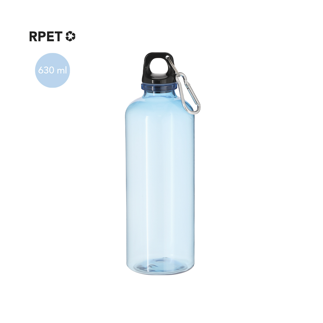 Bidón fabricado en resistente material RPET, con una capacidad de 630 ml. Cuerpo translúcido y tapón negro de cierre a rosca para garantizar un sellado óptimo. Incluye mosquetón metálico que facilita su transporte. Libre de BPA.