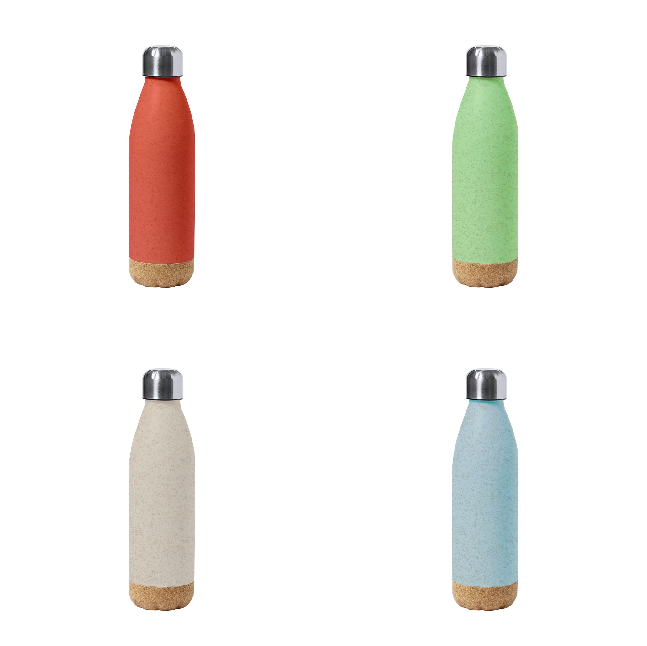 Bidón de 650 ml de capacidad, en combinación de PE veteado con base de corcho natural y tapón en acero inox.Tapón a rosca y libre de BPA. Disponible en variada gama de colores pastel mate y presentado en caja individual de diseño kraft.