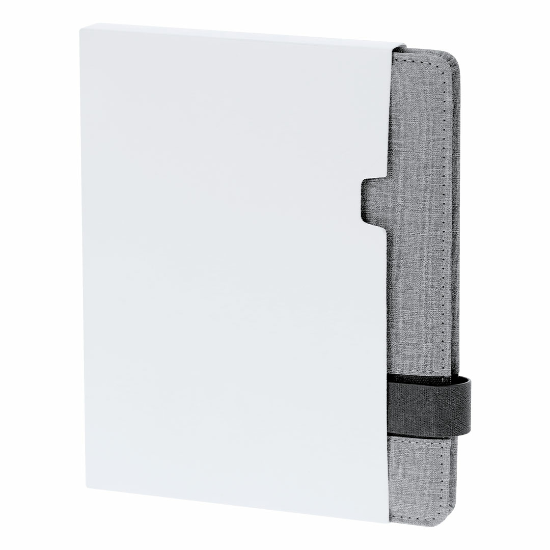 Bloc de notas A5 fabricado en PU. Elegante diseño gris con banda negra de cierre magnético a juego. Interior con 80 hojas color crema de disposición a una raya y marcapáginas de tela a juego.