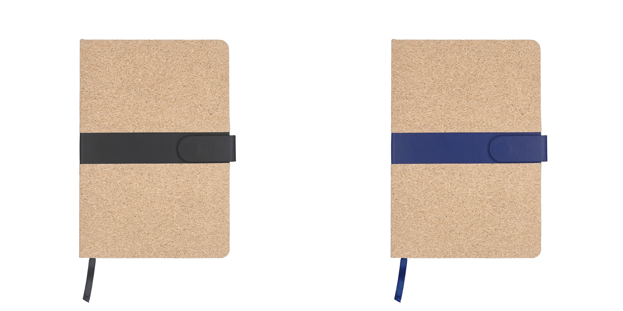 Bloc de notas A5 fabricado en corcho. Elegante diseño con banda central de PU y cierre magnético. Incluye 100 hojas color crema de disposición a una raya y marcapáginas de tela a juego.