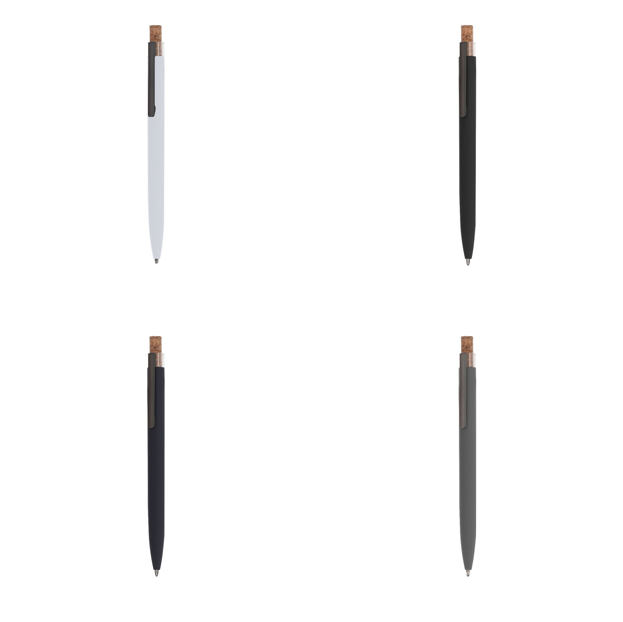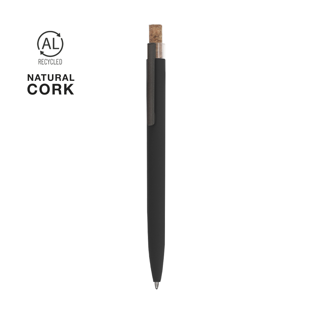 Bolígrafo de mecanismo pulsador fabricado en aluminio reciclado. Pulsador en corcho y cuerpo acabado goma, especialmente diseñado para marcaje en láser. Clip metálico y distintivo aluminio reciclado en la parte superior del bolígrafo. De cartucho jumbo y en tinta azul.