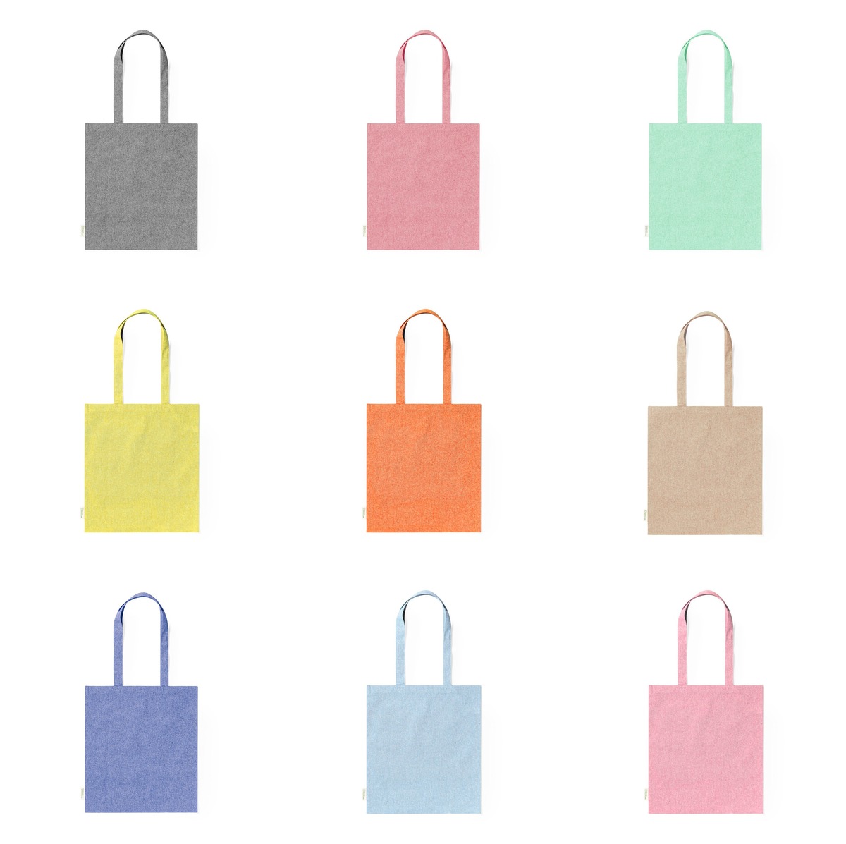 Bolsa fabricada principalmente en algodón reciclado de 140g/m2. Certificación GRS (Global Recycled Standard / Estándar de Reciclaje Global), que garantiza el origen reciclado del material usado para fabricar el producto. De acabaco cosido, con asas largas reforzadas de 70 cm y disponible en variada gama de colores. Resistencia hasta 8kg, incluida etiqueta con distintivo de algodón reciclado.
