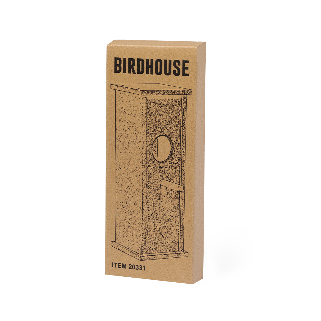 Caseta colgante para pájaros fabricada en resistente madera. Un acogedor refugio para aves muy fácil de montar, con amplio orificio de entrada para un cómodo acceso. Presentada en caja individual kraft.