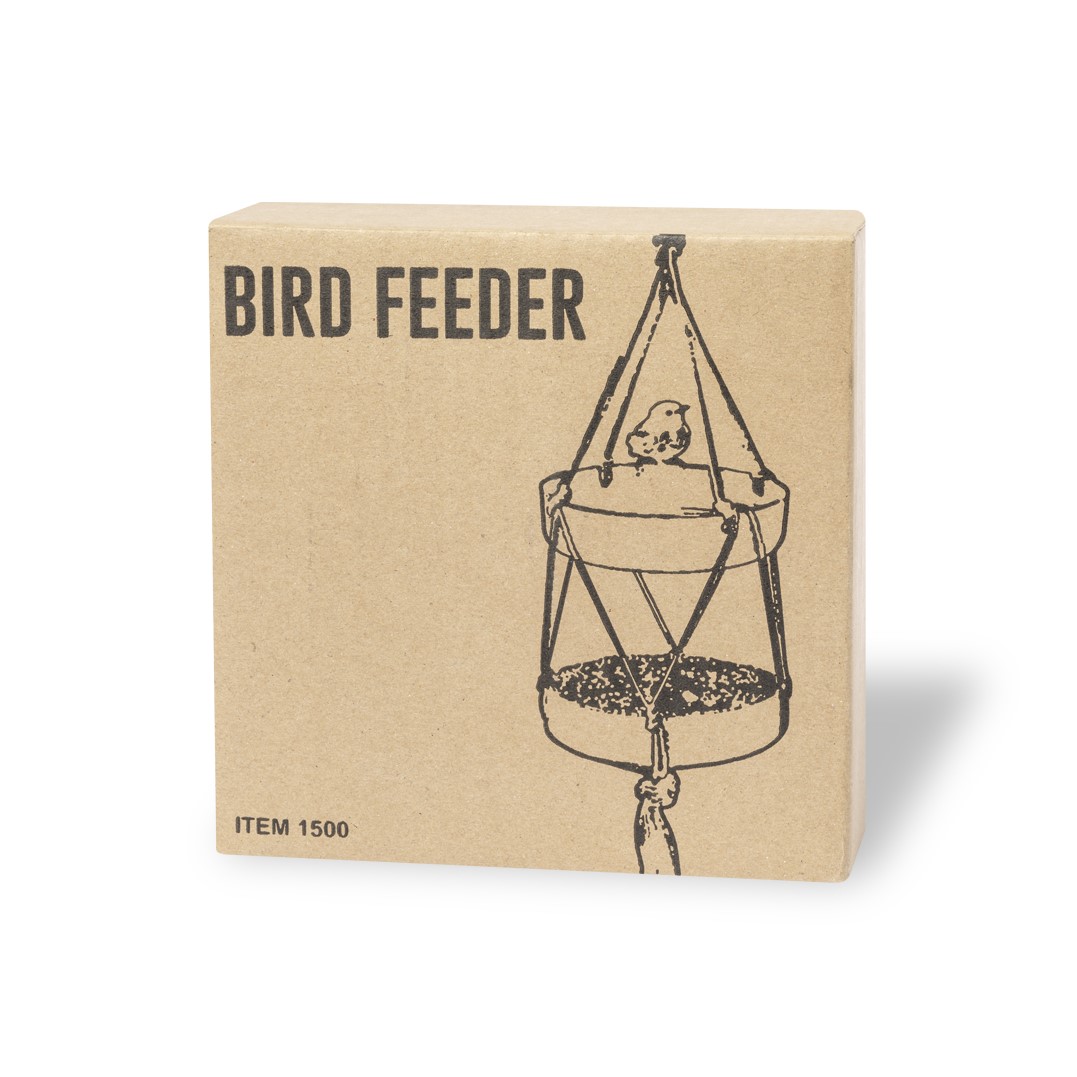Comedero colgante para pájaro. Con dos recipientes fabricados en fibra de bambú (medidas 15 x 4 cm cada uno) y resistente cuerda de algodón natural. Presentación en caja individual de diseño kraft.