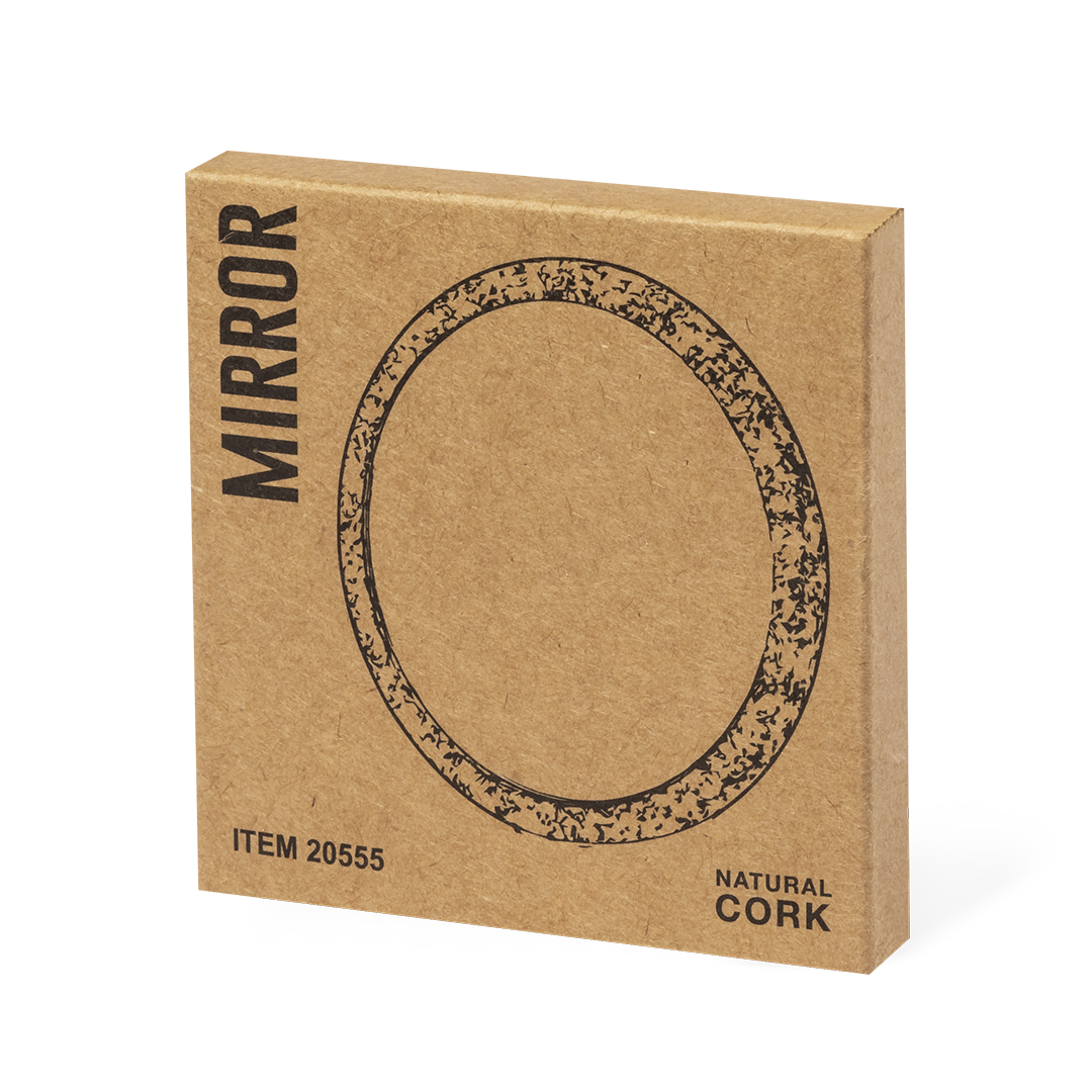 Espejo 1X fabricado en corcho. Práctico espejo portátil recubierto de suave corcho y presentado en una caja individual diseño kraft.