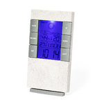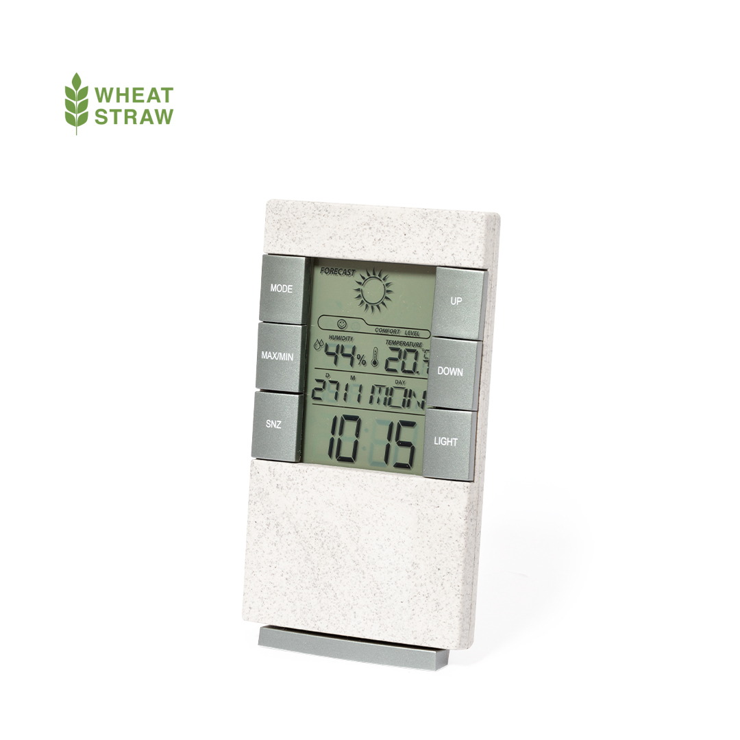 Estación meteorológica fabricada en caña de trigo, con termómetro e higrómetro. Función de hora, calendario, alarma y día de la semana, fácilmente visibles en la pantalla retroiluminada. Con base soporte y enganche para colgarlo. Alimentación a pilas (2xAAA no incluidas) y presentada en atractiva caja de diseño kraft. Disponible manual de instrucciones en español e inglés.