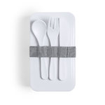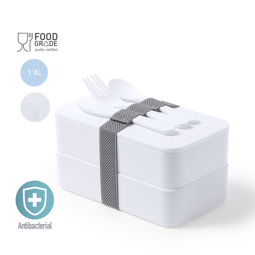 Fiambrera antibacteriana en resistente material PP de acabado sólido, libre de BPA. Dos compartimentos, cada uno de 700 ml de capacidad y cinta de seguridad con tenedor, cuchara y cuchillo.