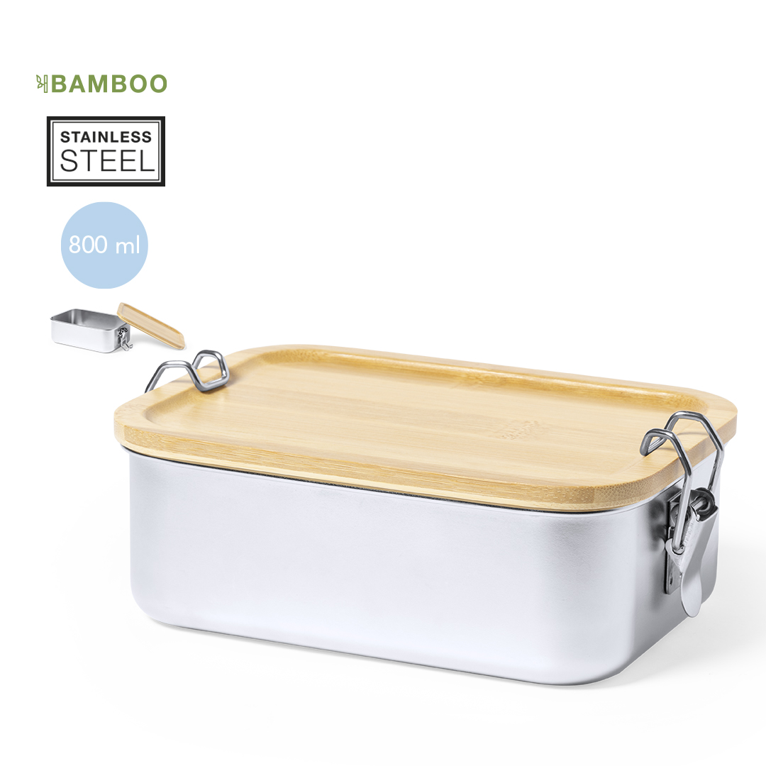 Fiambrera de 800 ml de capacidad, fabricada en acero inox. Con tapa hermética en bambú y libre de BPA. Presentada en caja individual de diseño kraft.