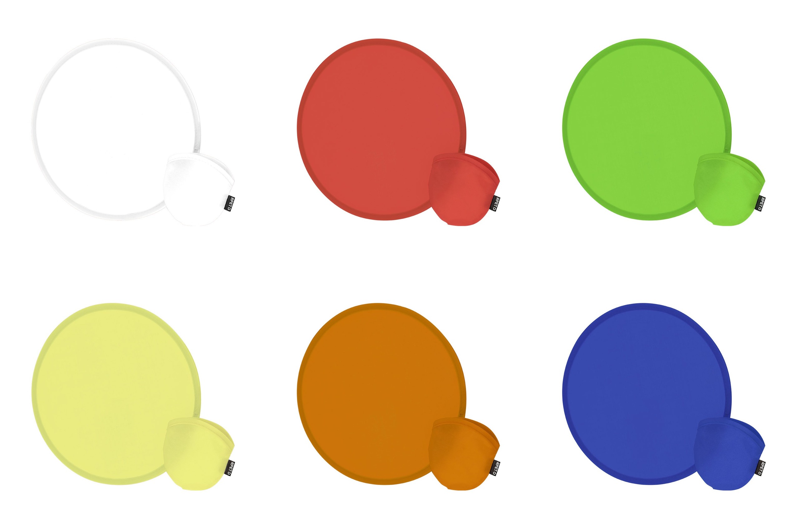 Frisbee plegable fabricado en RPET 190T,. Con funda individual a juego y sencillo sistema de plegado para tamaño compacto.