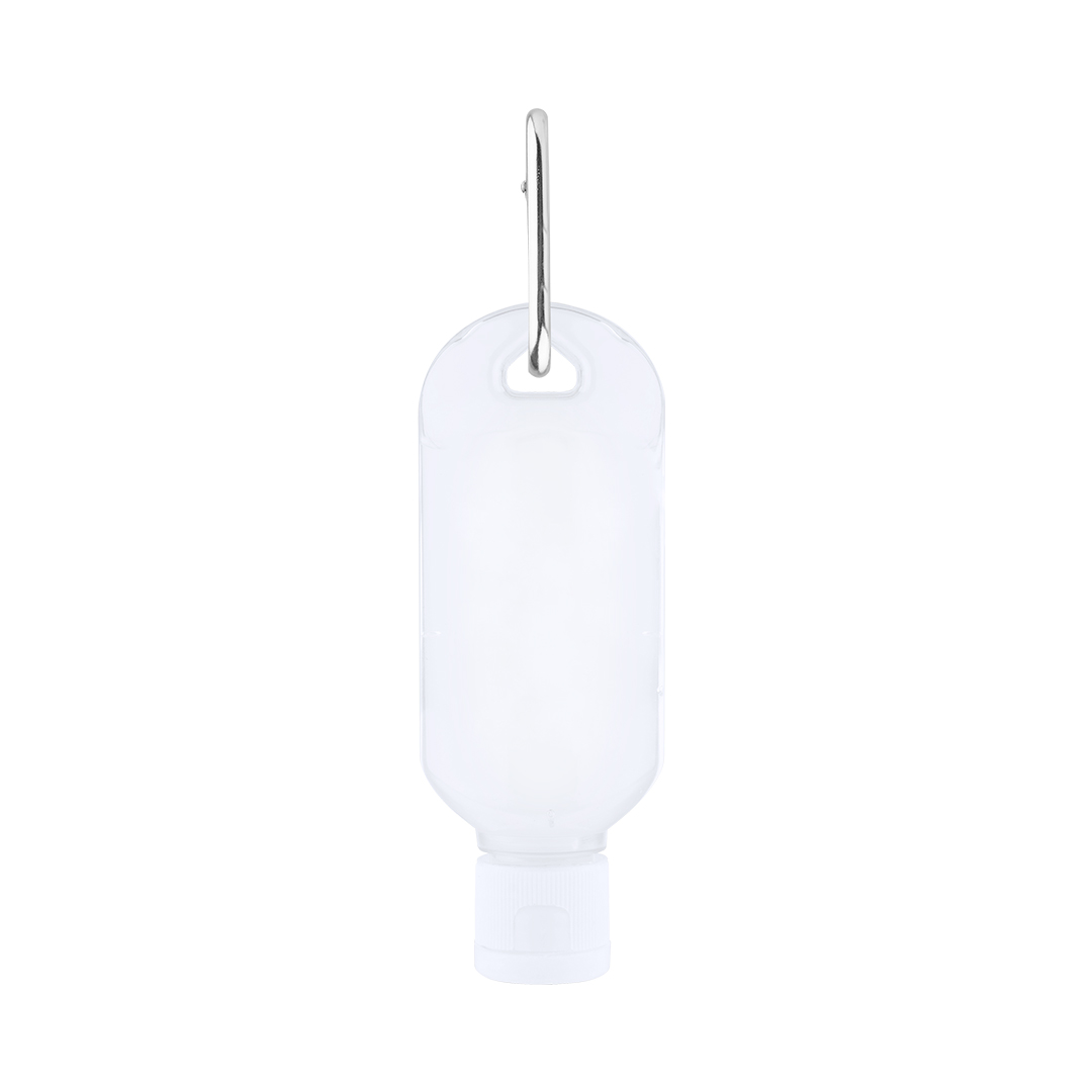 Gel hidroalcohólico para higiene y limpieza de la piel en bote rellenable de 30 ml. Cuerpo en color transparente, con dosificador, tapón de seguridad y mosquetón para transporte / fijación. Solución con 65% de contenido de alcohol.