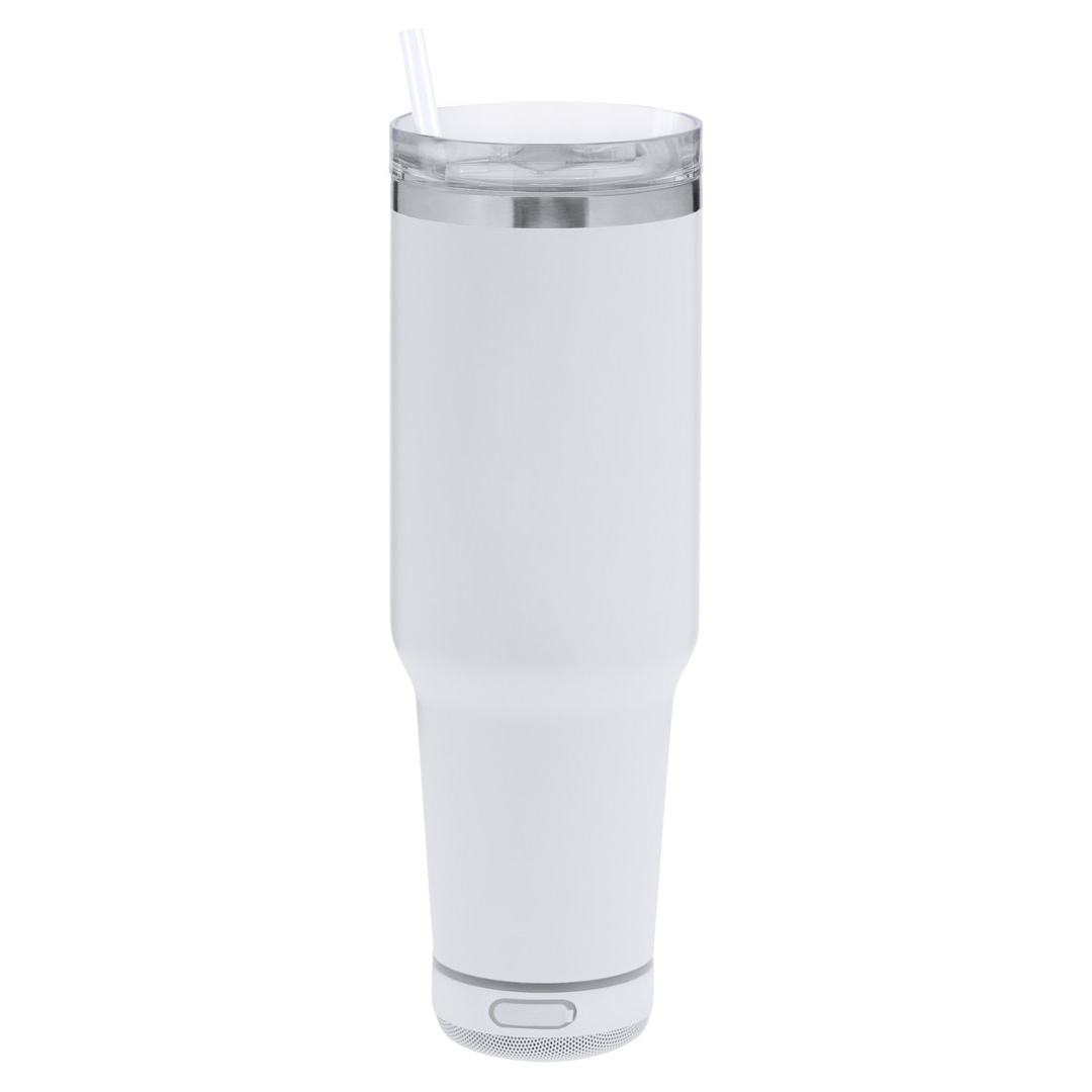 Taza térmica con Altavoz Bluetooth® 5.3 de 3W integrado. Con 1,25L de capacidad, asa ergonómica y fabricado en acero inoxidable de doble pared, asegurando una durabilidad máxima y un excelente mantenimiento de la temperatura de las bebidas, ya sean frías o calientes. Es ideal para tener en tu escritorio, mesa o en cualquier superficie donde disfrutar tranquilamente de tu bebida favorita. La tapadera cuenta con un cierre a presión y un dosificador de fácil apertura, libre de BPA, garantizando seguridad y facilidad de uso. Cuenta con base antideslizante, a juego, que proporciona una mayor estabilidad.