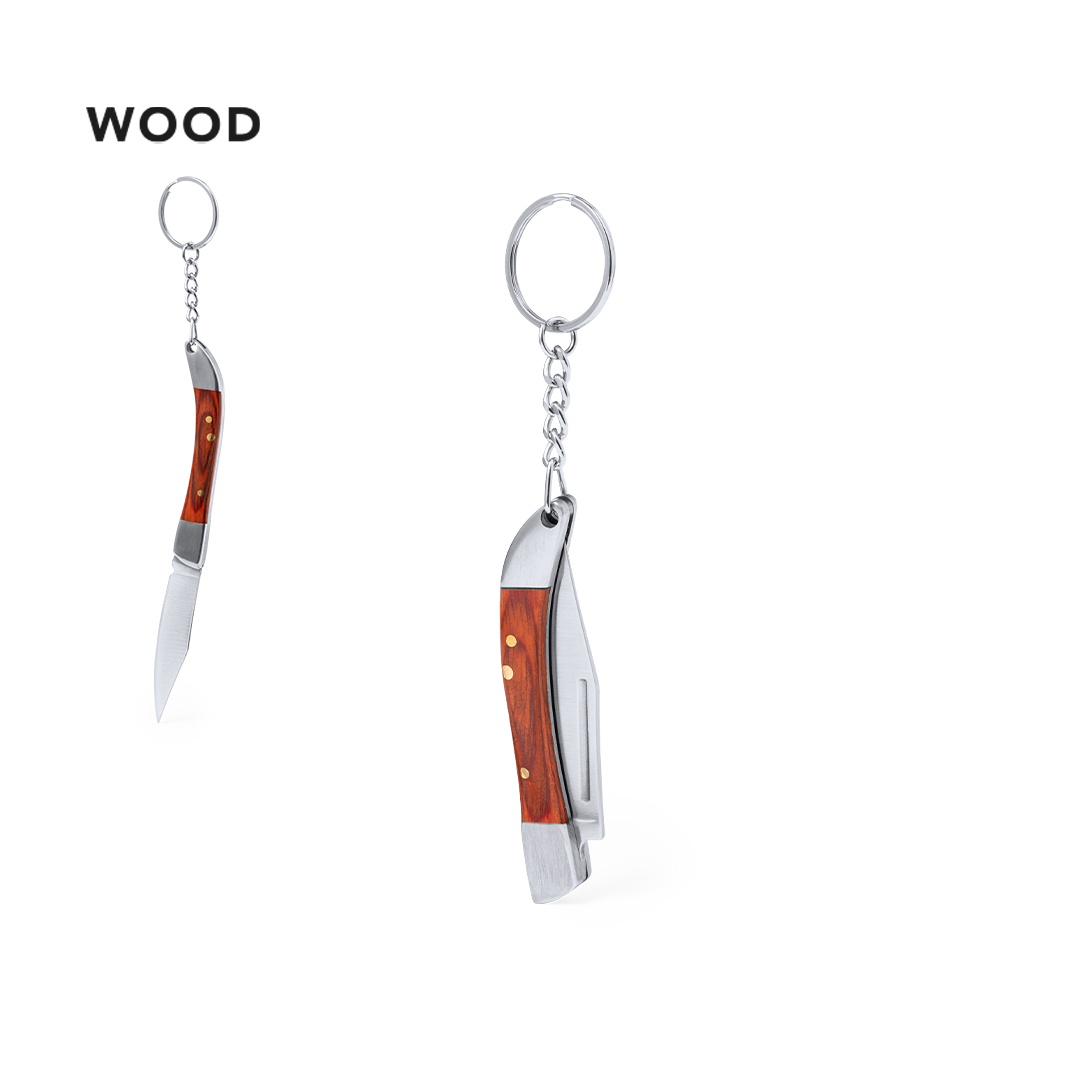 Práctico llavero navaja con hoja de acero inox y resistente empuñadura metálica con detalles en madera natural. Presentado en caja de diseño kraft.