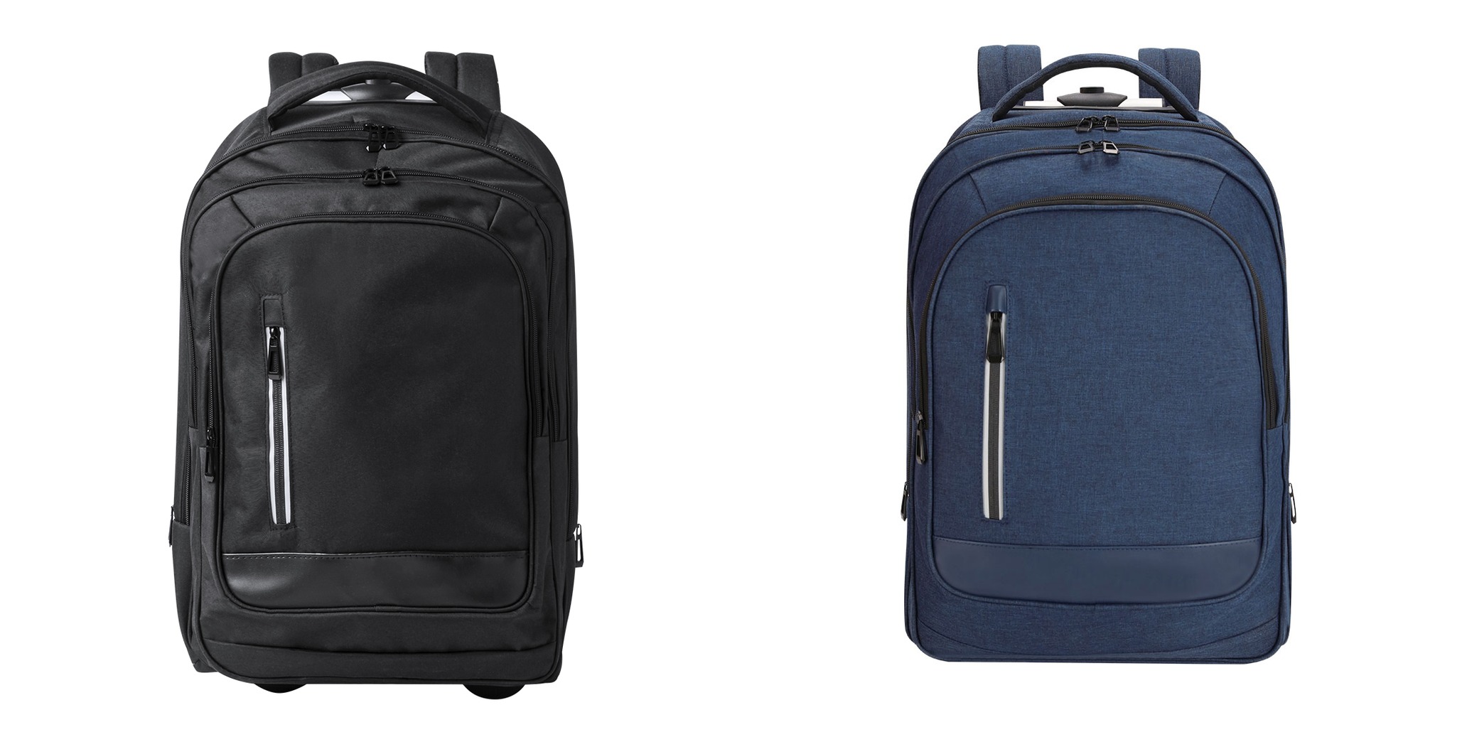 Mochila trolley de 2 ruedas en poliéster 300D de alta calidad. Incluye compartimento interior acolchado para ordenador portátil de hasta 15 pulgadas. Con asa exterior reforzada a juego y prácticos bolsillos en parte frontal. Con cremalleras a juego, además incluye cintas para hombro acolchadas y ocultas en parte posterior para usar como mochila. Presentado en bolsa individual reciclada.