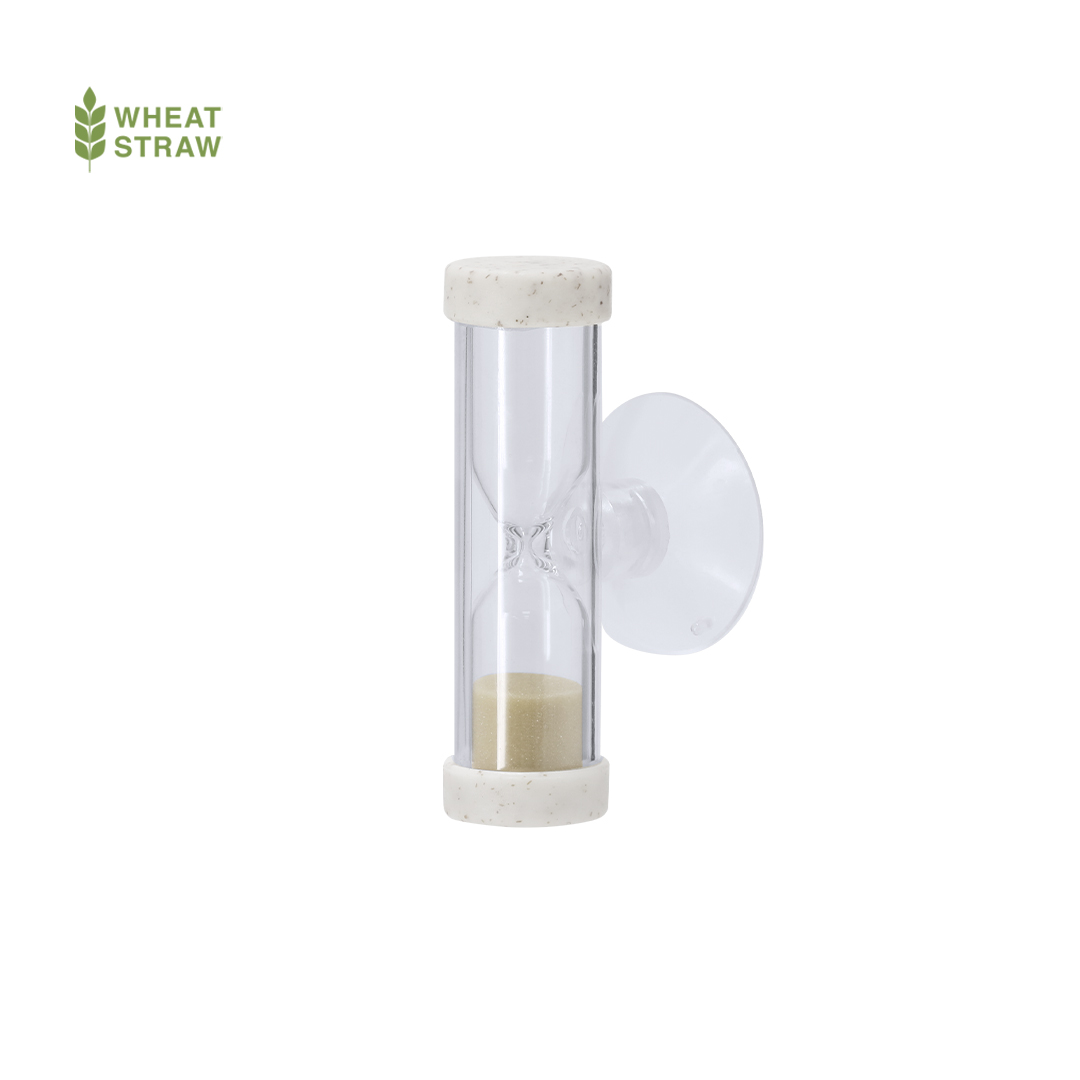 Reloj de arena con duración 2 minutos, fabricado en combinación caña de trigo y cristal. Cuenta con una práctica ventosa que permite fijarlo fácilmente.