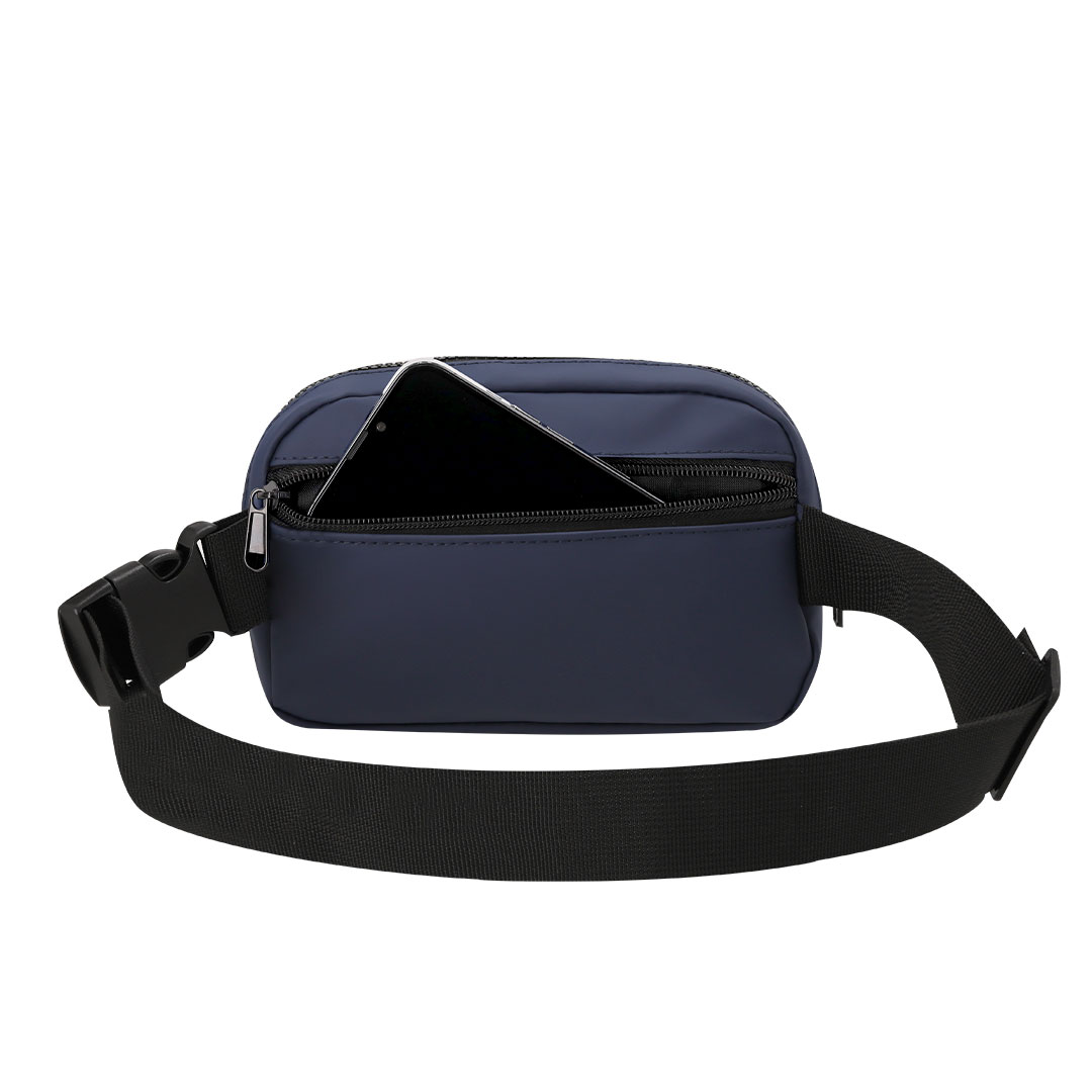 Riñonera de diseño fabricada en PU. Cuenta con un bolsillo central cierre de cremallera y cinta ajustable con cierre de hebilla. Además, incluye bolsillo trasero con cierre de cremallera para mayor seguridad.