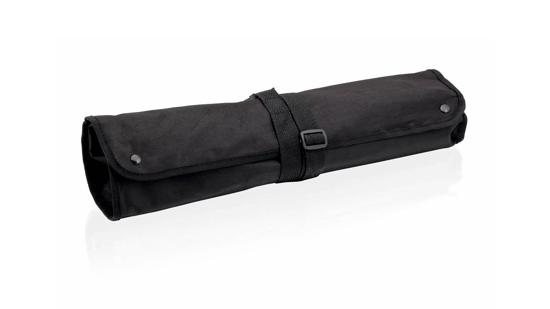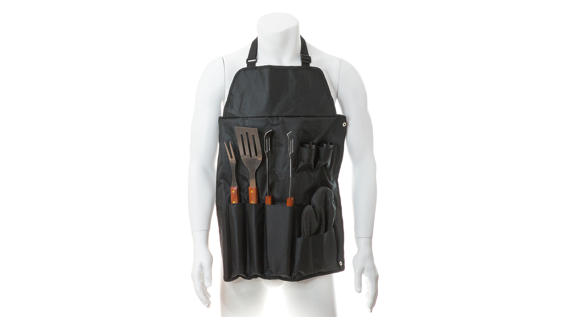 Set de barbacoa de 7 accesorios. Incluye paleta, trinchador y pinzas de acero inox con mango de madera. Con manopla acolchada y botes dosificadores para sal y pimienta. Presentado en estuche de resistente poliéster 600D en color negro con cierre de botones metálicos. Con cinta de transporte ajustable con cierre de clic en resistente nylon.