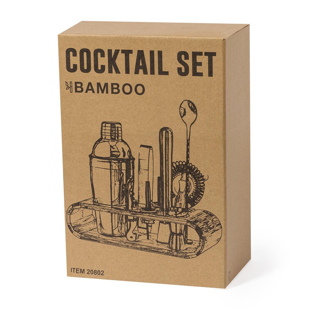 Elegante set de cóctel en acero inox. Completo set que combina conceptos modernos a la par que tradicionales. Incluye todos los utensilios esenciales para configurar los mejores cócteles. Con original base de bambú para guardar y exponer todos los utensilios. Presentado en distinguida caja de diseño kraft.