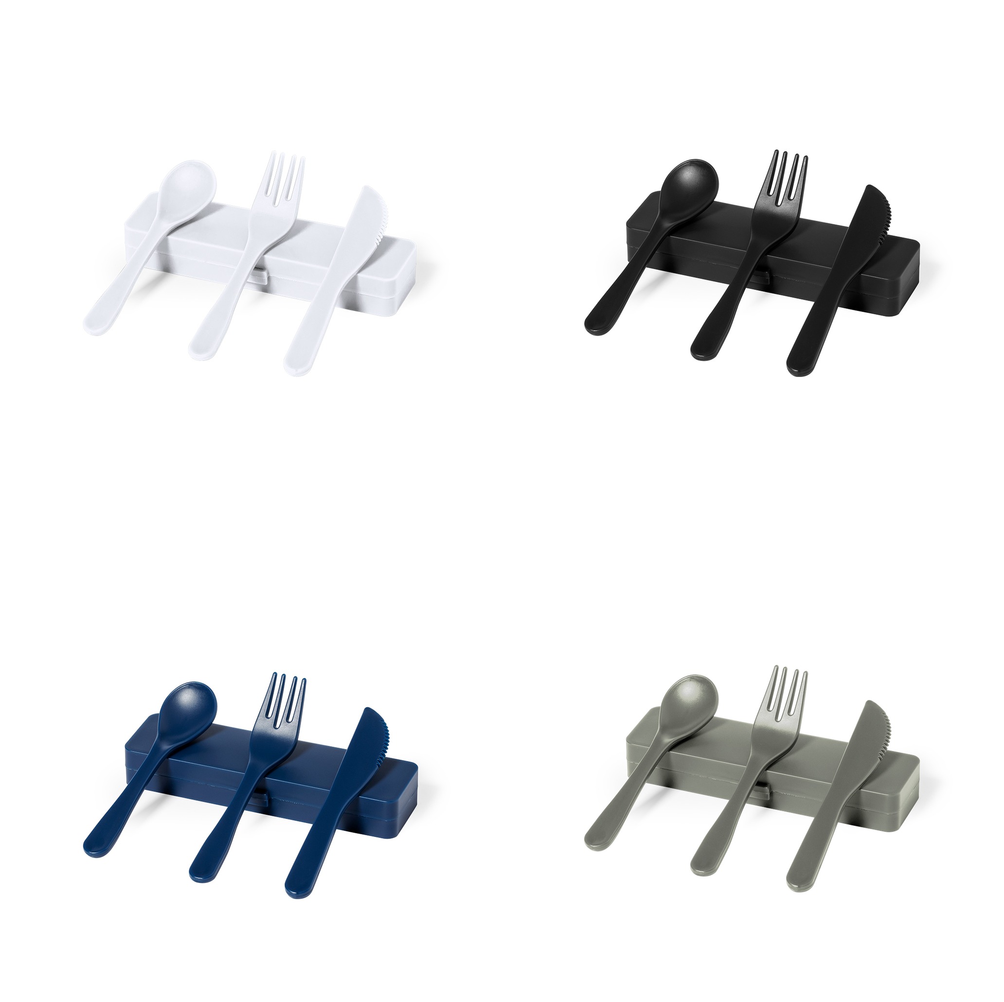 Set de cubiertos fabricados en PP reciclado libre de BPA, con estuche de presentación a juego. Incluye cuchara, tenedor y cuchillo. Dispone de Certificación Food Grade, garantizando la seguridad cuando los alimentos entran en contacto con el material usado para fabricar el producto. Estuche esterior y cubiertos en acabado mate disponibles en variada gamas de colores. Presentados en bolsa individual reciclada.