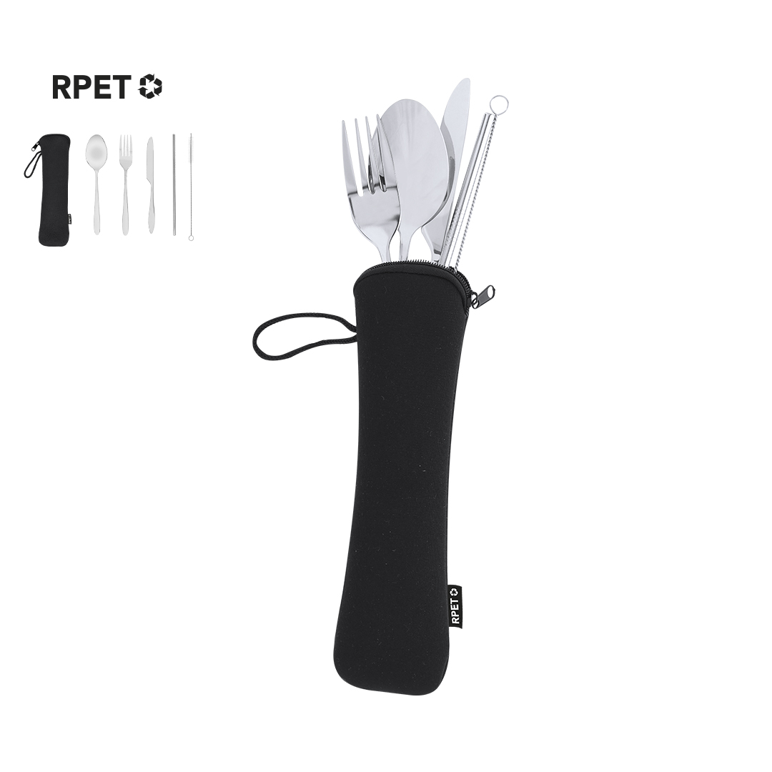 Set de cubiertos de 5 piezas fabricados en acero inoxidable. Incluye cuchara, tenedor, cuchillo, pajita reutilizable y cepillo limpiador para la pajita. Presentación en funda de Soft Shell en RPET con cierre de cremallera y cordón de transporte. Con distintivo de RPET en etiqueta.