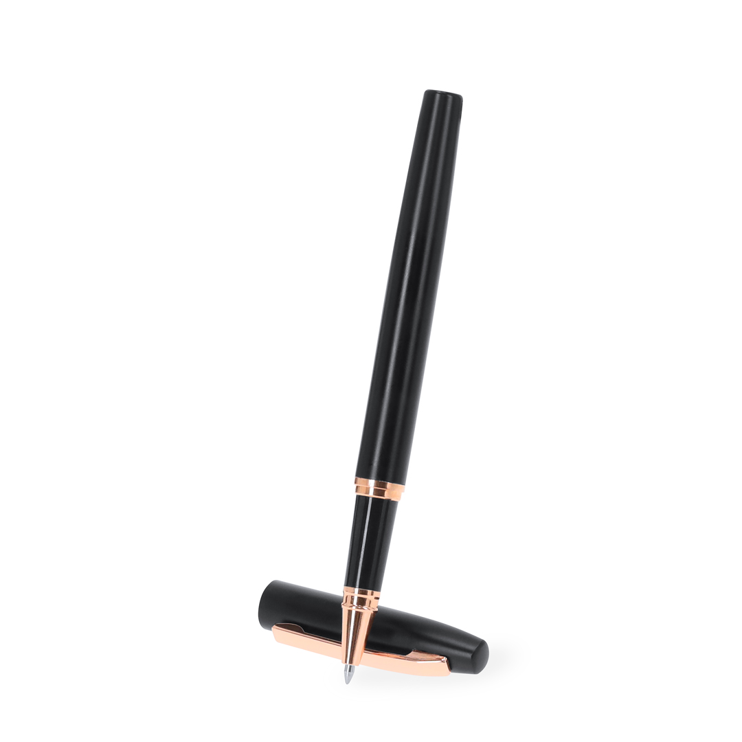Set de bolígrafo y roller fabricados en Aluminio Reciclado, en elegante diseño negro mate con distinguidos accesorios en acabado oro rosa. Bolígrafo de mecanismo giratorio y roller con capucha, ambos con clip metálico. En tinta azul y logotipo de Aluminio Reciclado. Presentación en elegante estuche negro.