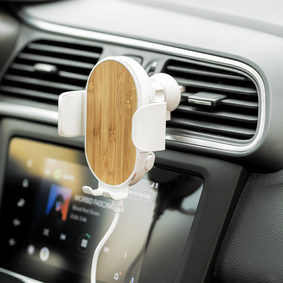 Soporte Cargador Inalámbrico de Coche Limited Edition. Un estilo innovador, donde sostenibilidad, diseño y última tecnología se combinan en una calidad premium. Fabricado en bambú y carcasa en resistente ABS y caña de trigo, para así fomentar la utilización de materias primas naturales y reducir las emisiones contaminantes. Con cargador inalámbrico de 15W. Compatible con dispositivos móviles de carga inalámbrica, con cable cargador USB C de 100 cm y manual de instrucciones en Español e Inglés incluidos.