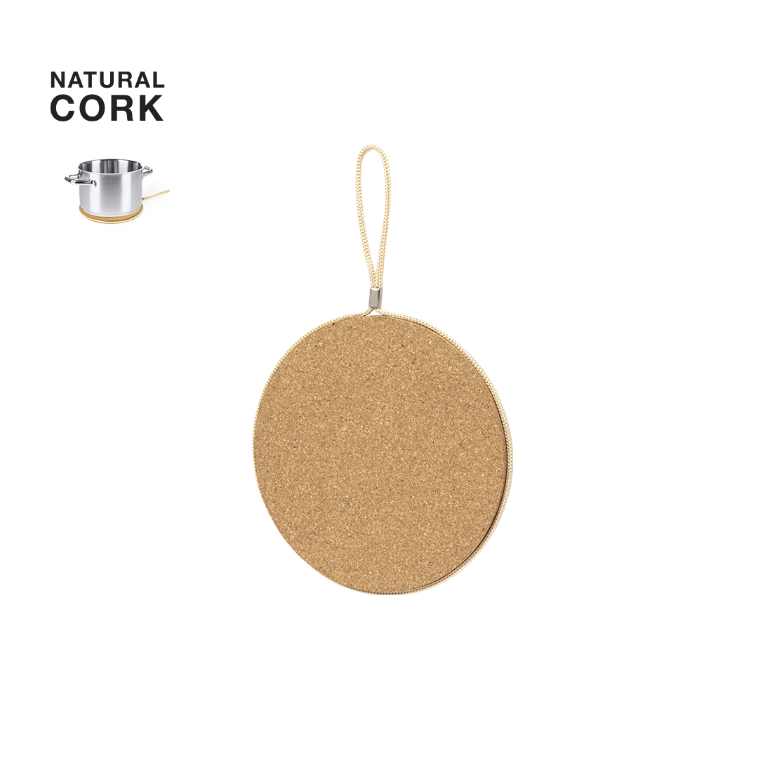 Práctico soporte de cocina fabricado en corcho natural. Es resistente a altas temperaturas y está especialmente diseñado para apoyar recipientes calientes como ollas y sartenes, preservando la superficie que hay debajo. Con cordón en la base para colgar.