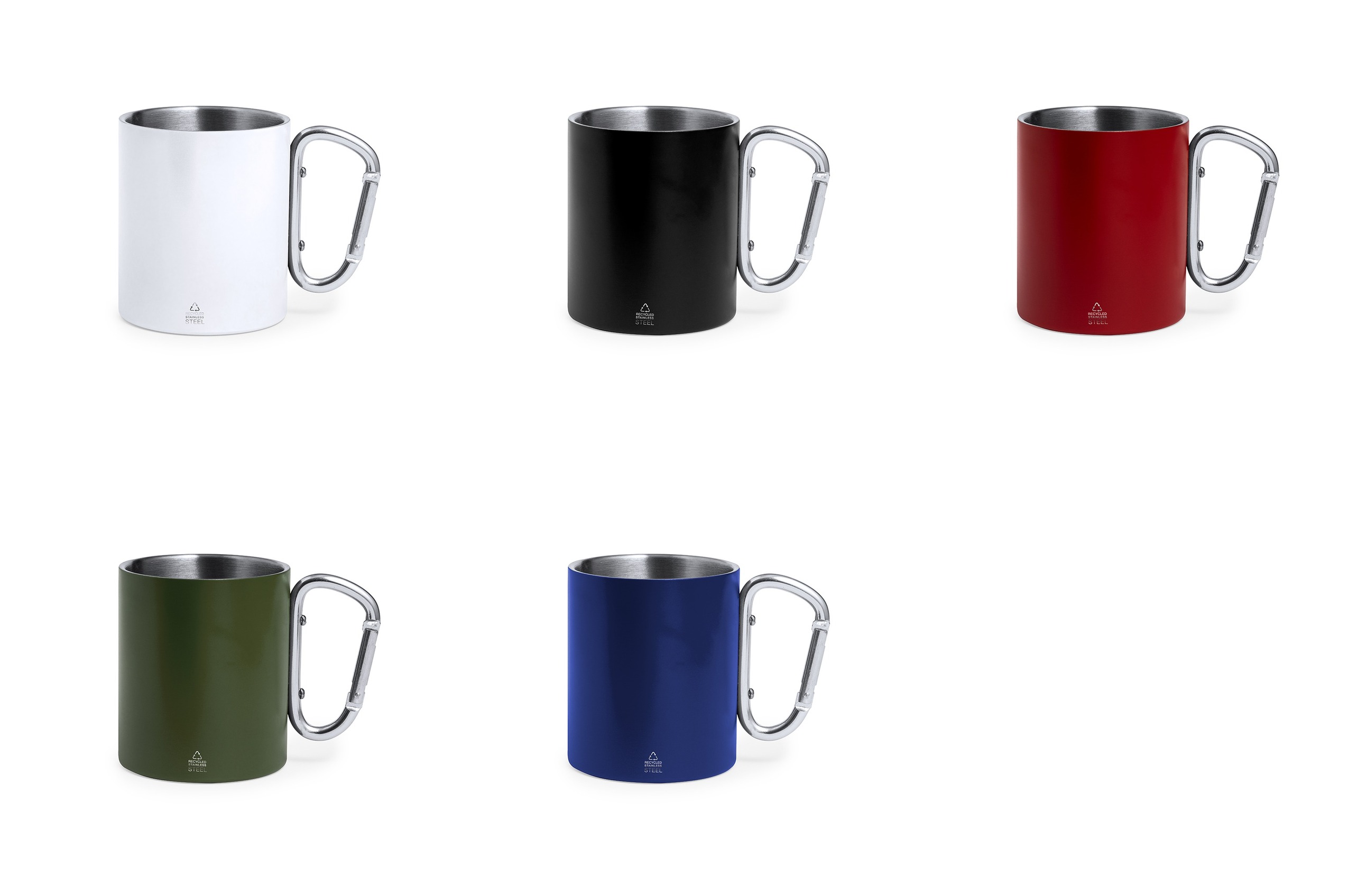 Taza doble pared en Acero Inox Reciclado de 300 ml. Con asa en forma de mosquetón para fácil transporte y cuerpo en variados colores mate. Presentada en caja de diseño kraft.