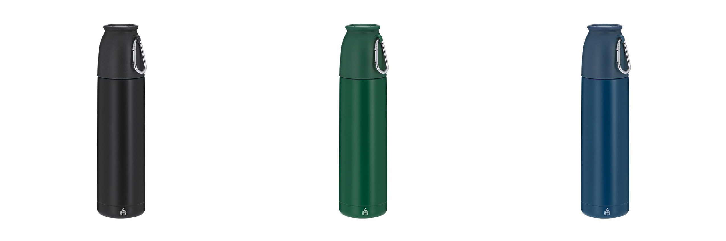 Set de termo con taza fabricado en Acero Inox Reciclado. Termo de 500 ml de capacidad y de doble pared, que garantiza una mejor y más duradera conservación de la temperatura, con dosificador de seguridad. Taza de 120ml, ajustable mediante rosca y con práctico mosquetón de transporte. Termo y taza en acabado mate a juego ideales para disfrutar de la bebida, ya sea caliente o fría, en cualquier momento y lugar. Con distintivo de Acero Inox Reciclado.